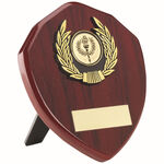 Rosewood Shield And Gold Trim Trophy - (1" Centre) 4". Add an engraved plate to this item for just £1. Tick for engraving and add the details to the text box.