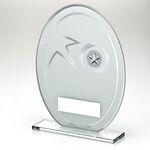 White/Silver Printed Glass Oval And Wreath Design With Plate (1" Cen) - 8". Choose a centre for this trophy - any sport or your own logo. Select from the "Customisation" section. Add an engraved plate to this item for just £1. Tick for engraving and add the details to the text box.