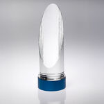 Clear Glass Round Column On Blue Metal Base (70MM Diameter) - 9.25In. New for 2026. This item can be customised with text and a logo. Tick the box for engraving or colour print, upload your logo and add your text to the box provided.